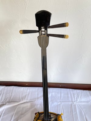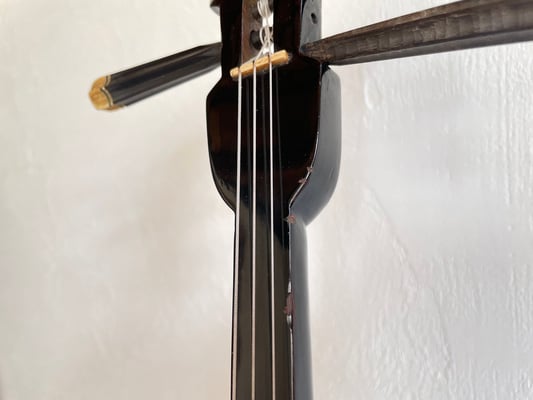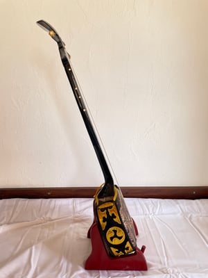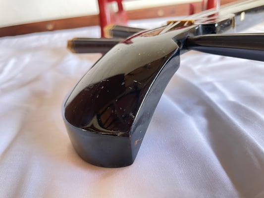 この三線は、古さを敢えてそのままに、漆のかけや、傷、ヒビもそのままにしました。太鼓だけ張り直し、最低限度弾ける状態にだけ修復した程度しか手を加えていませんので、傷も大変多くそのため、価格はかなり安く提供いたしますが、ハマシタンの入手困難な希少性と、ヴィンテージ物という二点からを考えるとかなり破格かと思います。